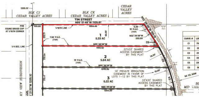 This spacious 5.33-acre lot in the Peak View Ranchettes subdivision offers an impressive amount of land, measuring 213.77 feet wide and 1004.49 feet deep. The property is easily accessible via a county-maintained paved road. You have the flexibility to bring your own builder. Utilities with Rocky Mountain power, already stubbed to the lot. Each lot comes equipped with a culinary water connection through the Water Conservancy District and includes one share in the Peak View Ranchettes Irrigation Company. Notably, the sellers have installed secondary irrigation systems, making it easy to provide water for pastures and gardens. The lot extends beyond the existing fence line, offering additional space beyond the enclosed area, enhancing the overall appeal of this remarkable property.