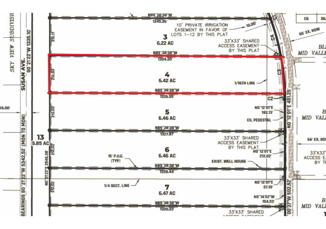 This spacious 6.42 acre lot in the Peak View Ranchettes subdivision offers an impressive amount of land, measuring 212.03 feet wide and 1304.30 feet deep. The property is easily accessible via a county-maintained paved road. You have the flexibility to bring your own builder. Utilities with Rocky Mountain power, already stubbed to the lot. Each lot comes equipped with a culinary water connection through the Water Conservancy District and includes one share in the Peak View Ranchettes Irrigation Company. Notably, the sellers have installed secondary irrigation systems, making it easy to provide water for pastures and gardens. The lot extends beyond the existing fence line, offering additional space beyond the enclosed area, enhancing the overall appeal of this remarkable property.