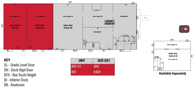 Unit 805 1/2 Total: 7,812 SF One (1) Dock High Door Unit 807 Total: 8,928 SF One (1) Dock High Door One (1) 12'x14' Grade Level Door With Ramp Unit 815 Total: 8,000 SF Total Available SF: 16,740 SF Gas Forced Heaters Throughout Clear Height: 14'-16' Zoning: M-1 (Manufacturing) Access: Easy Access From 2100 South Exit on I-15 and I-80 Location: Located in the Highly Desirable Salt Lake City Submarket