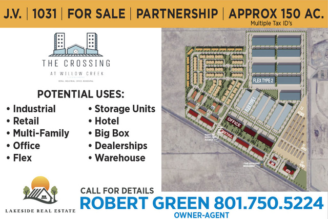 OUR GROUP IS LOOKING FOR A PARTNER/JV/1031 OR OUTRIGHT SELL. INCREDIBLE LAND OPPORTUNITY IN GRANTSVILLE UTAH. WELCOME TO "THE CROSSING" AT WILLOW CREEK IN GRANTSVILLE UTAH! THIS IS CURRENTLY A CONCEPTUAL DESIGN THAT WE ARE WORKING ON THROUGH THE CITY OF GRANTSVILLE. CHANGES CAN BE MADE TO ANY PART OF "THE CROSSING" AND WILL NEED APPROVAL BY THE CITY OF GRANTSVILLE. A DEVELOPING MIXED USE LAND ASSEMBILAGE OF APPROX 150 ACRES INCLUDING MULTIPLE OWNERS AND TOTAL INCLUDES THE FOLLOWING PARCELS: 01-130-0-0008 (APPROX. 60 ACRES), 30-0-0009 (APPROX. 20 ACRES), 01-130-0-0014 (APPROX. 14.34 ACRES), 01-130-0-0016 (APPROX. 19.14 ACRES) & 01-131-0-0002 (APPROX. 41.17 ACRES). WE ARE IN THE PROCESS OF ENGINEERING AND LOOKING FOR A POTENTIAL DEVELOPMENT PARTNER. JV OR 1031.... THIS LAND IS LOCATED ADJACENT OF THE FAMOUS RACETRACK AND INCLUDES CONCEPTUALS OF APARTMENTS, CONDOS, TOWNHOMES, COMMERCIAL RETAIL, COMMERCIAL OFFICE, INDUSTRIAL AND FLEX WAREHOUSE... A FANTASTIC BLEND OF MULTI FAMILY WITH MULTIPLE ACCESS POINTS INCLUDING A UDOT LIGHT AND SECONDARY ACCESS POINT. POTENTIAL OPPORTUNITY FOR AN INLAND PORT ZONING AND WATER TO BE APPROVED. PID LOANS ARE ALSO IN THIS POTENTIAL OPPORTUNITY THIS INLAND PORT ZONE AS WELL AS THE PID LOANS COULD POTENTIALY MEAN MOST TO ALL OF THE COST FOR INFRUSTRUCTURE COULD BE COVERED WITHIN THE ASSSTANCE OF THE INLAND PORT ZONE AS WELL AS THE COMPLETED PID LOANS! WE HAVE COMPLETED THE CONCEPT DESIGN AND ARE CURRENTLY WORKING WITH ENSIGN ENGINEERING, THE CITY OF GRANTSVILLE AND BLU DESIGN TO MOVE FORWARD FROM CONCEPT TO PLAT. USES ARE WIDE RANGED AND APPEAR ON THE CONCEPT DESIGN AS: COMMERCIAL, RETAIL, GAS STATION, DEALERSHIPS. HOTEL, INDUSTRIAL FLEX/ OFFICE, APARTMENT COMPONENT AS WELL AS CONDO/ TOWNHOMES AND STORAGE UNIT/ FACILITY. THERE IS A WIDE RANGE OF USES THAT HAVE POTENTIAL. WE ARE SURROUNDED BY GROWTH WITH THE CURRENT INDUSTRIAL PROJECTS AROUND THIS LAND, AS WELL AS A LARGE NUMBER OF HOUSING SITES DOWN THE STREET. THE CROSSING AT WILLOW CREEK WILL LOOK TO BE THE HUB FOR A FANTASTIC LOACTION OF MIXED USE. FEEL FREE TO CONTACT THE AGENT/ OWNER WITH QUESTIONS AND ANY INTEREST. CALL FOR DETAILS. ALL INFORMATION DEEMED RELIABLE BUT AS A COURTESY ONLY...ALL INFORMATION CONTAINED IN THIS MARKETING TO BE VERIFIED BY BUYER.