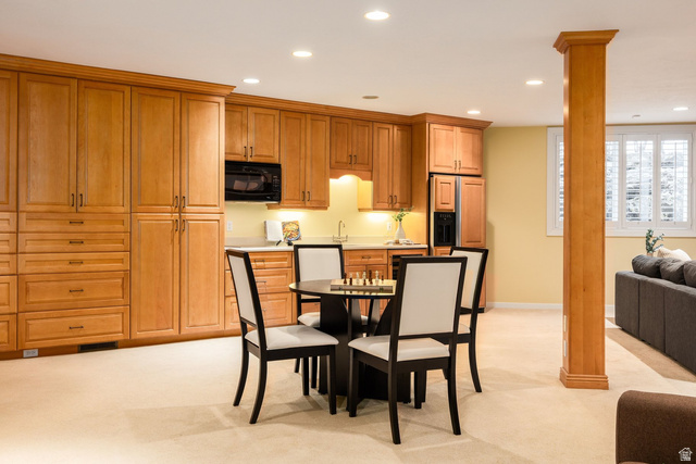 Tucked within a private gated community, 2115 E. Connor Park Cove offers refined living with thoughtful design at every turn. From the moment you enter the vestibule, you're greeted by soaring vaulted ceilings and stunning stained glass windows that bathe the living spaces in warm, colorful light. Designed for both elegance and longevity, the home features an elevator for effortless age-in-place living. The kitchen showcases custom cabinetry by Granite Mills, granite countertops, double ovens, a warming drawer, and a striking statement hood. A perfectly placed kitchen sink overlooks the quiet cul-de-sac, offering a charming view of daily comings and goings. Plantation shutters, skylights, and timeless finishes elevate the ambiance throughout. The spacious main-level primary suite is a true retreat, offering three walk-in closets, a bathroom with heated tile floors, a zero-entry steam shower, and extensive cabinetry for exceptional storage.The main level has been thoughtfully expanded with an enclosed porch, creating additional flexible living space, and includes a dedicated office along with a well-appointed laundry room featuring a utility sink for added convenience. Downstairs, the expansive lower level feels bright and welcoming with two more bedrooms framed by rock window wells that bring in natural light and pleasant outdoor views. A large family room with extensive built-ins, a kitchenette for guests or in-law living, and two beautifully remodeled bathrooms featuring marble countertops, heated floors, zero-entry glass showers, and heated towel racks. Additional highlights include central vacuum, two water heaters, two furnaces, new thermostats, a water softener, a safe, a storage room, and a tiled garage floor with built-in cabinetry to keep the space looking sharp year-round. The HOA provides exceptional ease of living, covering lawn mowing and trimming, exterior water and sprinkler maintenance, snow removal and shoveling, as well as front landscaping and gate maintenance, allowing you to simply enjoy the home. This great location has easy access to all the shops & restaurants in Millcreek & Sugar House. It is right around the corner from a local favorite, Cactus & Tropicals, Sugar House Park and a quick commute to the Utah Canyons to hike, bike & ski and the Salt Lake International Airport.