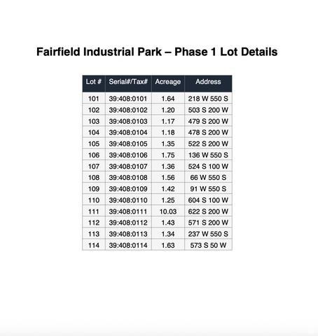Phase 1 release of Fairfield Industrial Park, an approved, phased light industrial development located off Allens Ranch Road in Fairfield, Utah County. Fourteen (14) entitled industrial lots (approx. 1.11.7 acres each) with the ability to combine parcels for larger footprint users. Phase 1 infrastructure improvements scheduled for Spring 2026. Utilities will be stubbed to each lot. Flexible deal structures available: Land sale, Ground lease (NNN), Build-to-suit. Seller financing available. This offering provides multiple exit strategies: Resale of finished pads, Vertical development and hold, Ground lease income model, Owner-user build opportunities. Part of a larger 75+ acre master-planned industrial park with phased expansion. Limited light industrial inventory in western Utah County positions this project for long-term growth as infrastructure and regional expansion continue westward. Price shown is for lot 113. Contact listing agent for lot pricing, phasing plan, and development package.