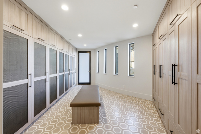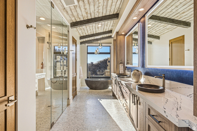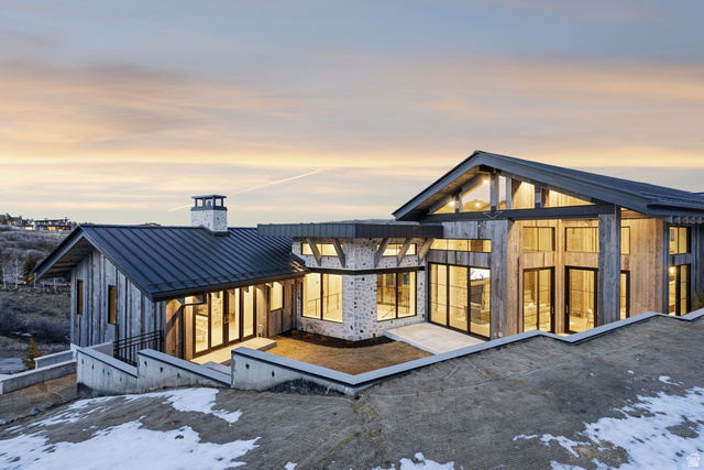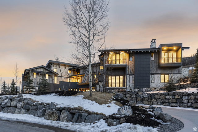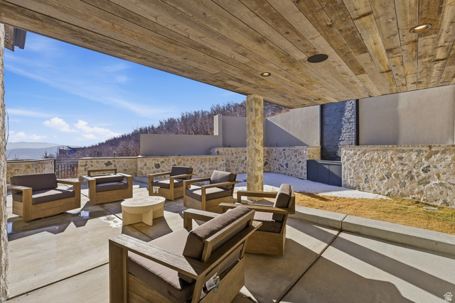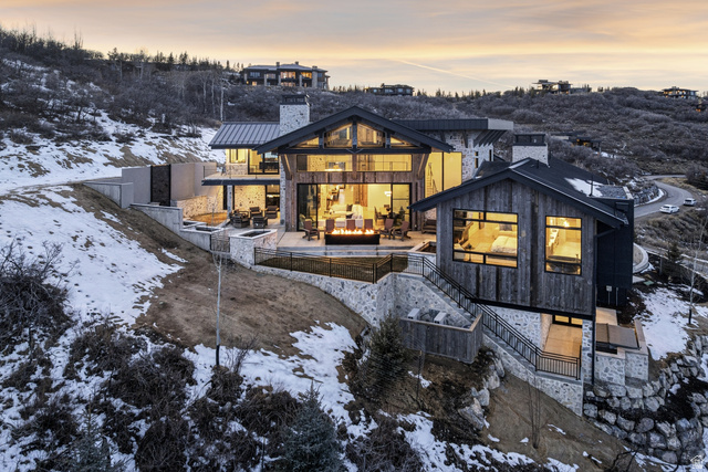 Welcome to one of the most unique custom homes in Promontory, a new Clive Bridgwater design set on three private acres in the quiet Deer Crossing neighborhood. Wrapped in hand-laid stone and barn wood with full interior and exterior radiant heat, this home is positioned to capture wide-open Uintah Mountain views that bring natural light and calm into every major space. Large floor-to-ceiling sliders open to heated outdoor living areas with a bar that connects directly to the backyard, a full outdoor barbeque area, a waterfall feature, a fire pit, and two private real-grass backyards for pets. The main level offers a thoughtful layout with three bedrooms, including a beautiful primary suite with two large walk-in closets. A standout feature is the private fitness and golf wing, where the gym and golf simulator share their own exterior entrance, allowing trainers or instructors to come and go without disturbing the main home. The gym area opens to a hot tub patio with mountain views. The lower level also includes a movie theater, guest suite, bunk room, and a temperature-controlled wine cellar holding approximately 1,800 bottles. A major standout feature is the third-level ensuite office with a dramatic bridge entry looking over the entire home. Car collectors will love the 2,000 sq ft garage with 14-foot ceilings designed for lifts and up to 8 vehicles, plus a heated wrap-around driveway for easy winter access. Surrounded by aspens and pines in a peaceful setting known for wildlife and with walking-trail access to Promontory's main Village Clubhouses, this home comes fully furnished and turn key, with a full golf membership available. This is a rare opportunity to own one of Clive Bridgwater's final custom homes in one of the most private settings in Promontory Club.