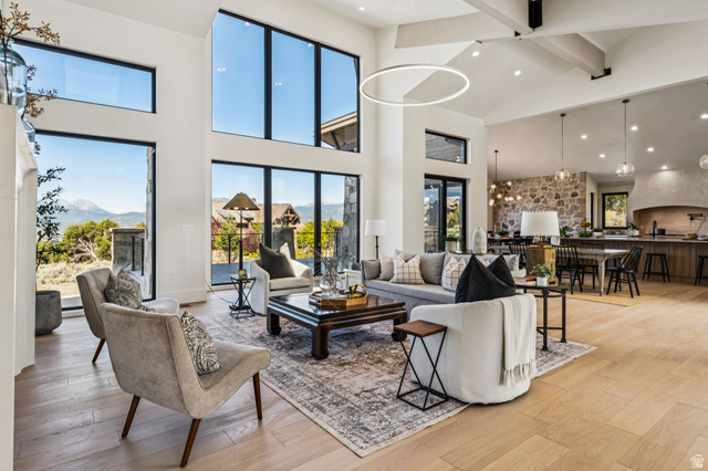 Experience luxury mountain living at its finest in this brand-new 6,500 sq ft contemporary masterpiece, ideally situated in the prestigious gated community of Red Ledges. Showcasing panoramic views of the Heber Valley and surrounding mountain range, this light and bright home is designed to impress. Featuring 5 spacious bedrooms, an expansive great room, and an impeccably designed kitchen with double islands. Downstairs has plenty of space for entertaining, with a gym and theatre room, every inch of this home blends modern elegance with mountain charm.