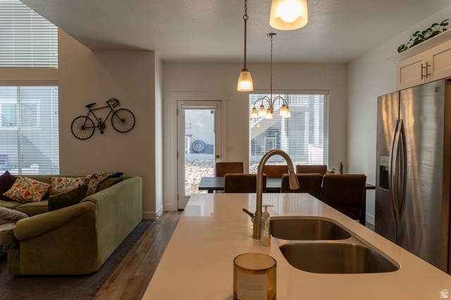Welcome to this upgraded Herriman townhome in the Sky Ridge community. Built in 2018, this home offers 4 bedrooms, 3 bathrooms, and over 2,200 square feet of living space with a finished daylight basement. The main living area features vaulted ceilings that create a bright and spacious feel. The kitchen has white shaker cabinets, quartz countertops, and brushed nickel finishes throughout. The layout flows easily from the living room to the kitchen and dining area, making it ideal for everyday living or hosting friends and family. The finished basement adds valuable extra space. It includes a large family, a full bathroom, a fourth bedroom, and multiple storage areas, including under-stair storage and a finished pantry space. Residents in Sky Ridge enjoy access to a clubhouse, gym, swimming pool, parks, playgrounds, and miles of nearby biking and hiking trails. The location offers quick access to Mountain View Village shopping, restaurants, Daybreak amenities, and the new Salt Lake Bees stadium. Buyer to verify all info.