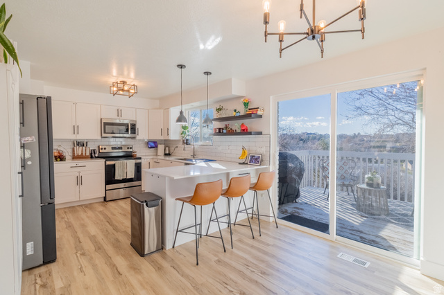 Tucked away on a quiet, secluded street in South Ogden, this beautifully updated home offers the perfect blend of privacy, comfort, and stunning scenery. Enjoy breathtaking views of the Ogden Valley right from your deck-an ideal spot for relaxing evenings or morning coffee. Inside, the home features a bright open living space centered around a cozy fireplace, creating a warm and inviting atmosphere. The remodeled kitchen showcases modern finishes and updated appliances, perfect for both everyday living and entertaining. Recent upgrades include newer windows, flooring, paint, fixtures, and appliances, giving the home a fresh, move-in ready feel. Outside, mature trees provide shade, beauty, and additional privacy, enhancing the peaceful setting. With its secluded location, scenic views, and thoughtful updates throughout, this South Ogden home is a rare find.